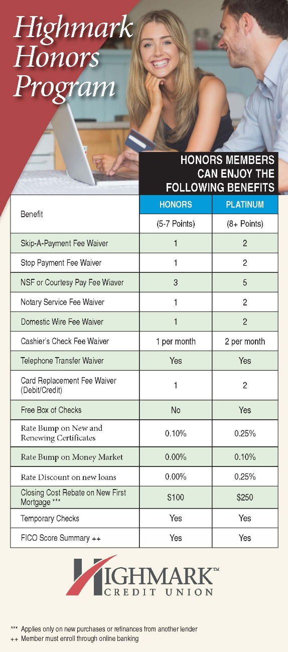 Rewards Program Membership is available to all Highmark Credit Union members age 18 and over. Eligibility begins at the end of the month after account opening. Youth Accounts are not eligible for Rewards Membership. You must be a member in good standing with the Credit Union and keep at least $1.00 in your Regular Share Account to be eligible. Members who have been disqualified from Honors Membership are not eligible for the 50+ Year Relationship. Accounts are reviewed regularly to determine continued eligibility for Membership. Members can advance at any time during the calendar year unless they are no longer a member in good standing or have less than $1.00 in their Regular Share Account. Once attained, Rewards Membership is good through December 31 of that calendar year and is reviewed at that time to ascertain continued eligibility.