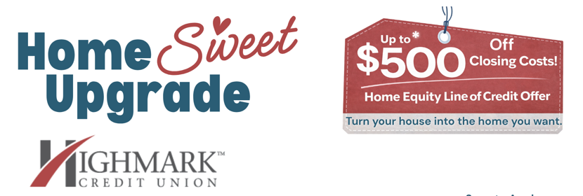 *Offer valid for a limited time and subject to chance or cancellation without notice. Closing cost credit applies to new Home Equity Line of Credit (HELOC) accounts only, and is based on approved credit line amount at closing. Credit will be applied at closing and cannot excelled actual closing costs incurred. Minimum credit line of $25,000 required. Property insurance is required. Flood insurance may be required. Membership eligibility required. All loans are subject to credit approval, verification of collateral, and underwriting guidelines. Rates, terms, and conditions are subject to change. Other restriction may apply. Contractors are not affiliated with or acting on behalf of Highmark Credit Union. Borrowers are not required to work with any specific contractor to obtain financing. Additional terms and conditions available at HighmarkFCU.com.